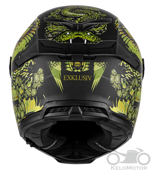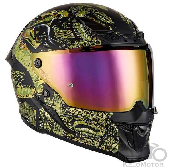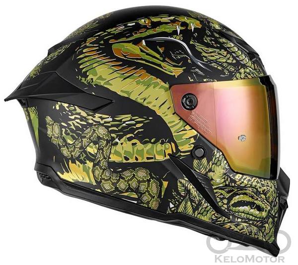 – mitológiai dizájn merész stílusban, a teljes sisakot nagy hüllőmotívumok ölelik körül, szimbolizálva a dizájn misztikus szellemét