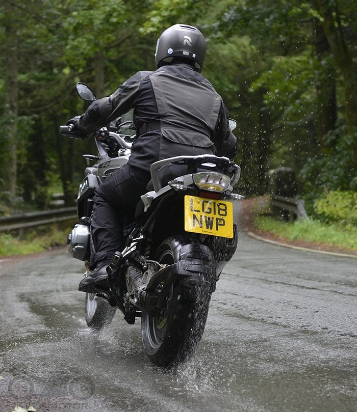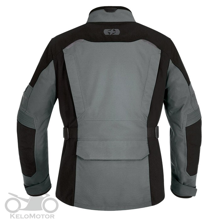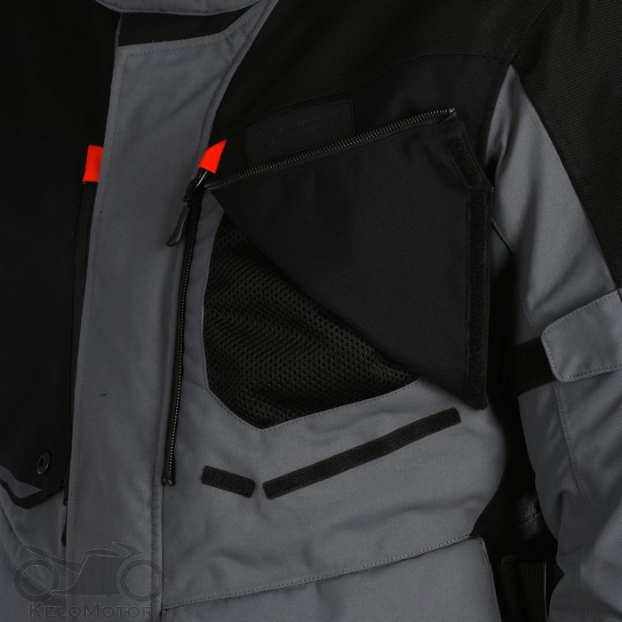 Hosszított fazonú motoros vízálló túrakabát nagy méretű nyitható szellőzőkkel.