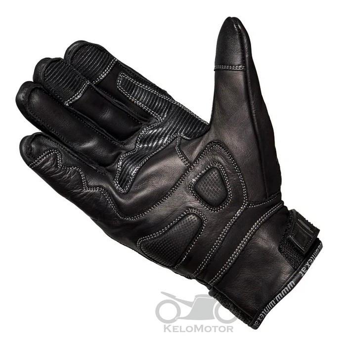 – a tenyérrész végig dupla bőr, megerősítéssel, lágy protektorokkal és, szilikonos csúszásgátlóval